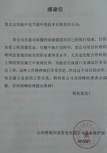 通過河曲EPC項目團隊的共同努力,我司承攬的山西魯能河曲發電有限公司旁路煙道EPC項目,工程建設質量優良,并在項目執行過程中,現場團隊表現出較高的職業素養及水平,受到業主的一致贊譽,同時也與業主建立了良好的合作關系。