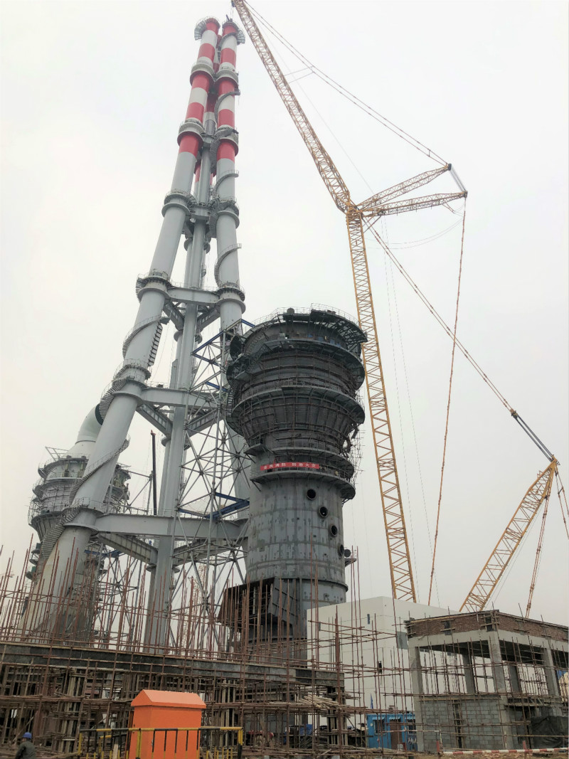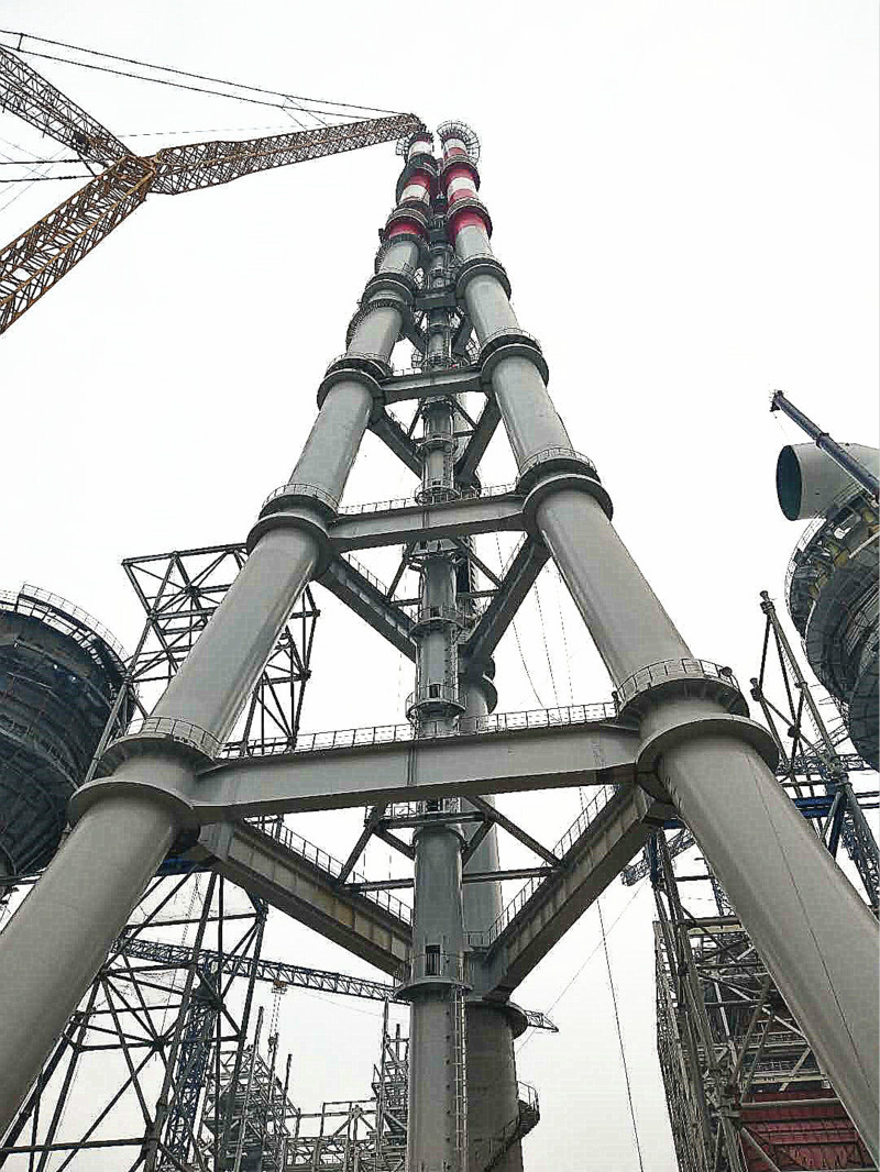 2018年12月25日上午10點10分,山鋼日照精品鋼基地2×350MW自備電廠工程三管自立式鋼煙囪第七層A、B、C筒順利吊裝就位,煙囪主體鋼結構吊裝到頂。這標志著我國第一根180米三管自立式鋼煙囪,也是首根采用內(nèi)壁鈦板貼襯防腐的大型鋼管結構煙囪的落成。