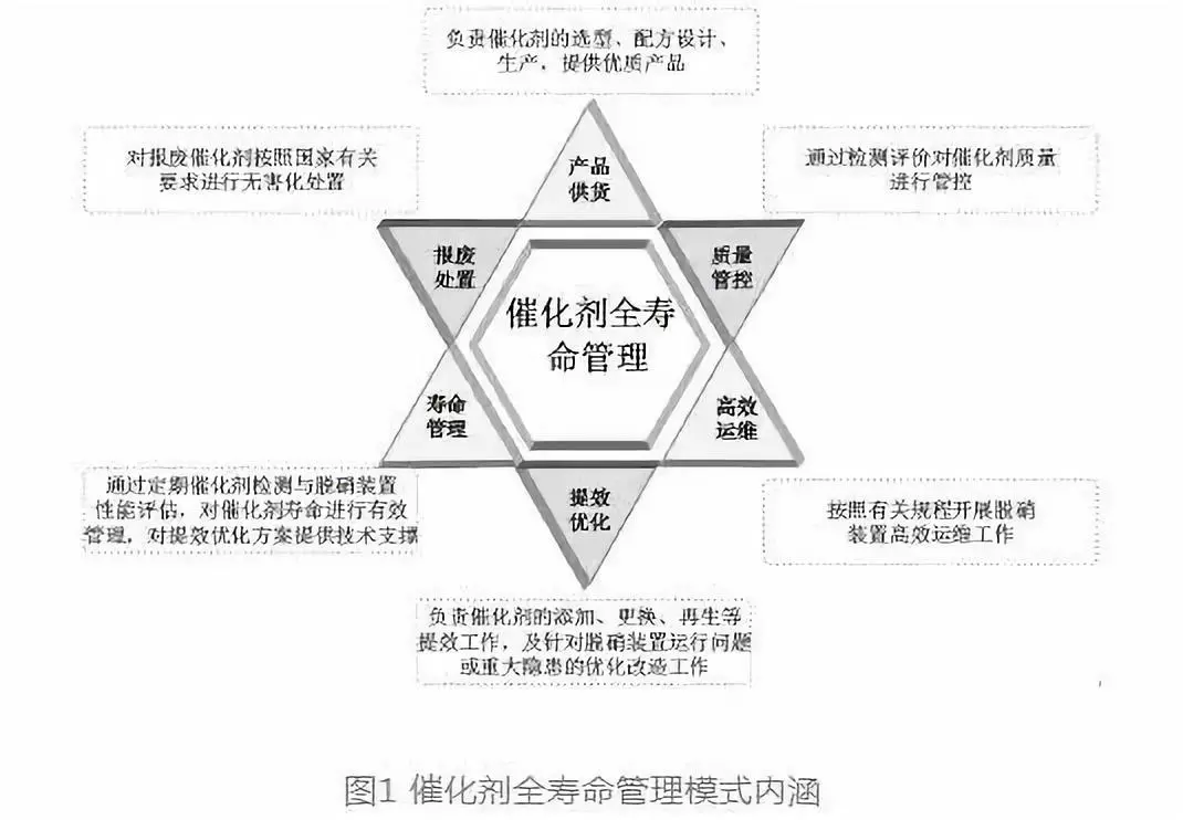 早期管理模式—主要應對環保達標排放以及技改工程限期治理要求,在早期大規模工程改造以及催化劑市場供不應求的形勢下,僅僅是單純粗放式的工程階段設備“買+ 裝”模式,缺乏對催化劑產品質量的管控。現行管理模式—鑒于早期管理模式在工程投運后產生的一系列問題,近年來發電企業對催化劑質量加強了管控,初步形成了“買+ 檢+ 裝+ 不定期檢”的模式,但由于缺乏連續性與整體性考慮,未能充分調動各方單位的參與度,責任單位往往在于發電企業,相關工作開展較為被動,難以實現對催化劑全壽命周期的采購質量、運行壽命以及脫硝運維成本的有效管控。
