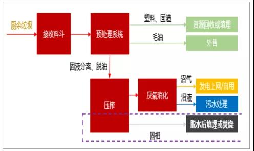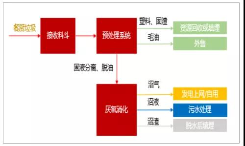 典型的餐廚垃圾厭氧消化工藝:餐廚垃圾經過分選后,提取塑料等雜物進行回收,漿料進行進一步的固液分離并提油,毛油外售,脫油后的料液全部進入厭氧發酵罐進行厭氧消化,產生的沼氣用于發電,沼液進入污水處理系統,沼渣則經脫水后外運填埋或焚燒。
