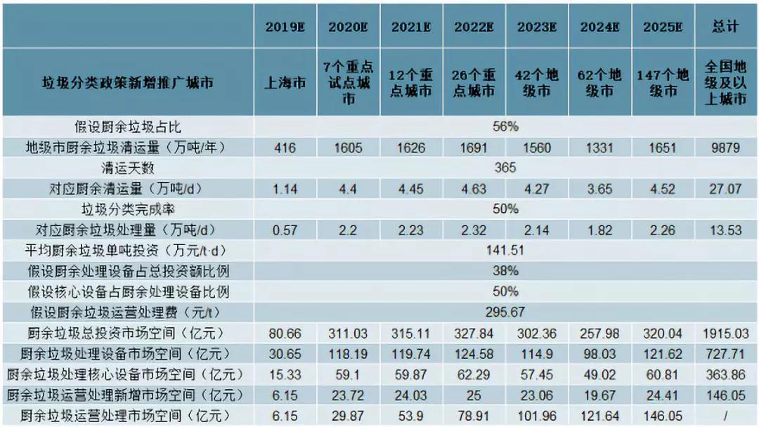以100個餐廚垃圾試點城市的平均餐廚垃圾項目單噸投資額76.6萬元/t,處理費197元/t作為合理估計值,可得上海環境松江、上海環境嘉定、海峽環保福州、首創環保寧波(一期)4個項目的平均廚余垃圾單噸投資額為141.5(萬元/t)。考慮到廚余垃圾的綜合處理費較高,假設廚余垃圾處理費是餐廚垃圾的1.5倍為295.7(元//t•d),以地級及以上城市平均每天產生約27萬噸廚余垃圾測算,在中性情景下(即垃圾分類完成率為50%),廚余垃圾總投資額市場空間為1915億;按廚余垃圾處理設備占總投資額的38%,核心設備占廚余處理設備的50%計算,對應市場空間為364億;2025年廚余垃圾運營處理市場的空間預計可達146億元,市場空間廣闊。